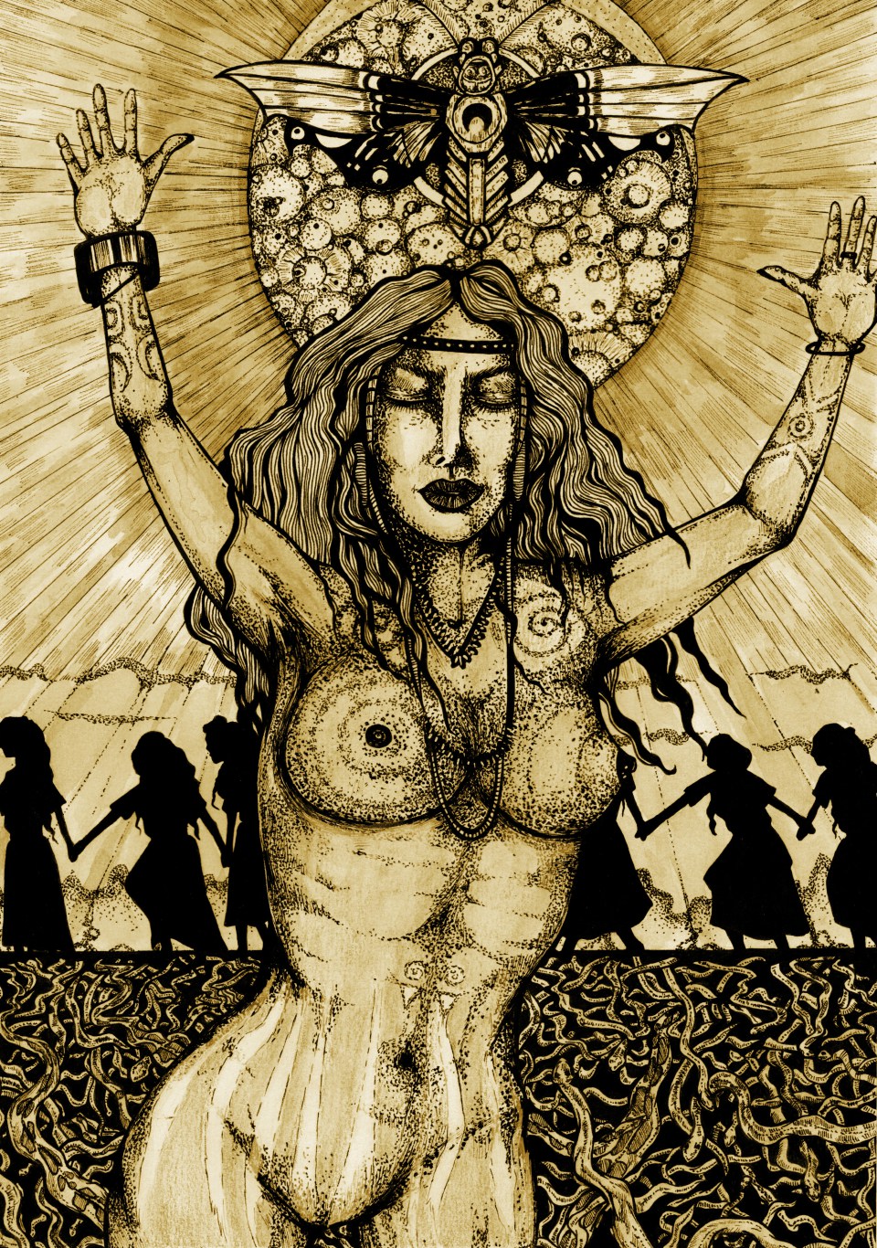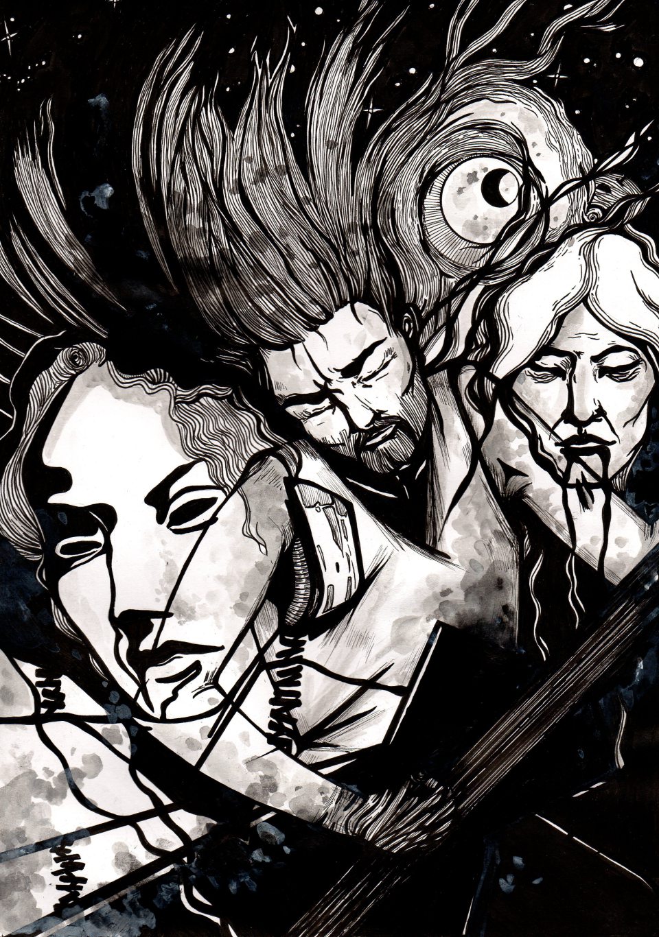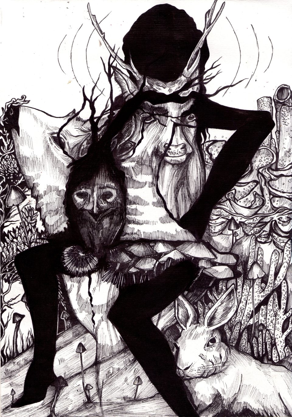 Fatima: Das Zeichnen hatte – und hat – viel mit Musik zu tun. In meiner Jugendzeit waren das Sachen wie z.B. Ulver, Beherit, Bathory oder Immortal. Das passte ganz gut, ich hatte ja den Wald vor der Haustür! (lacht.) Wobei ich nicht nachgezeichnet habe, was ich gerade gehört habe. Die Musik war einfach gut, um sich zu konzentrieren und in einen Schaffensprozess hineinzufinden. Heute höre ich zum Zeichnen immer noch gerne alte Heroen wie P.J. Harvey oder Nick Cave.