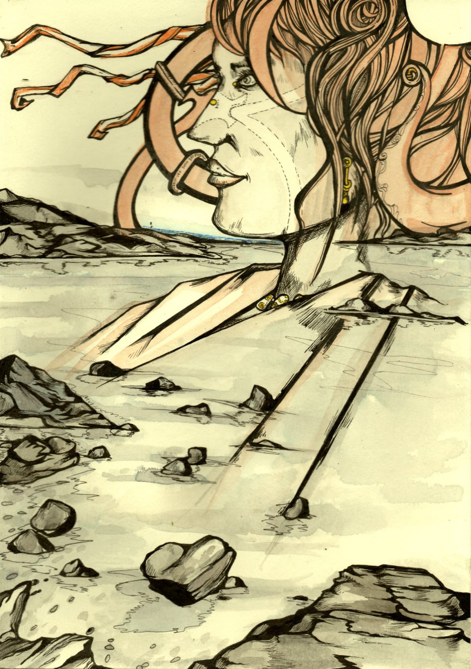 Fatima: An sich sind es die gleichen Arbeitsmittel geblieben, nur die Materialien sind besser geworden. Es ist immer ein Bleistift, ein schwarzer Feinliner, Tinte oder ein Kugelschreiber auf Papier. Von anderen Dingen wie Kohle oder reinen Bleistiftzeichnungen bin ich wieder abgekommen. Irgendwann ist Acryl dazugekommen, was eigentlich nichts auf Papier zu suchen hat. (lacht.) Ich benutze es mehr wie Aquarell-Farbe. Meistens sind die Bilder schwarz/weiß und auf einmal kriege ich einen Rappel und dann muss da noch Farbe dazu.